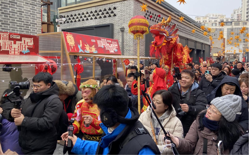 當(dāng)日舉行的巡游活動(dòng)將氣氛推向高潮。由雪餅猴、舞龍舞獅、糖葫蘆NPC、二次元、瘋狂動(dòng)物城等角色組成的多元方陣,沿著主街歡樂(lè)行進(jìn)。
