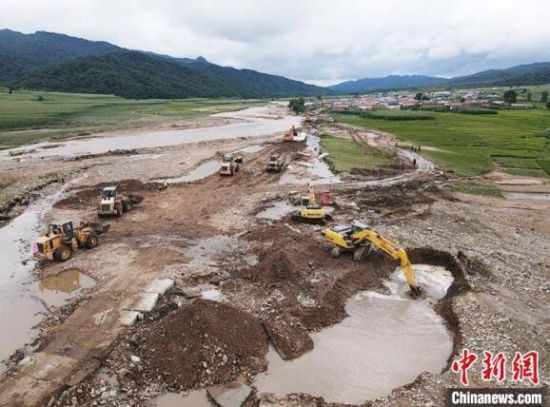 工程車輛正在搶修道路。(無人機照片) 記者 蒼雁 攝