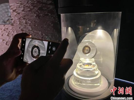 2021年7月17日,全球建筑規(guī)模最大的天文館——上海天文館開館。當天的開館儀式上,與會嘉賓為“天外來物”——月壤入館揭幕。該部分月壤樣品被封裝在水晶球中,供觀眾近距離觀看。(資料圖) 中新社記者 鄭瑩瑩 攝