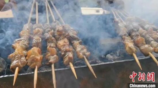 活動(dòng)現(xiàn)場(chǎng),多種新鮮食材在炭火的炙烤下散發(fā)出陣陣香氣。除了傳統(tǒng)的烤肉串之外,還有烤全羊、烤河蚌、烤鯽魚等菜品。