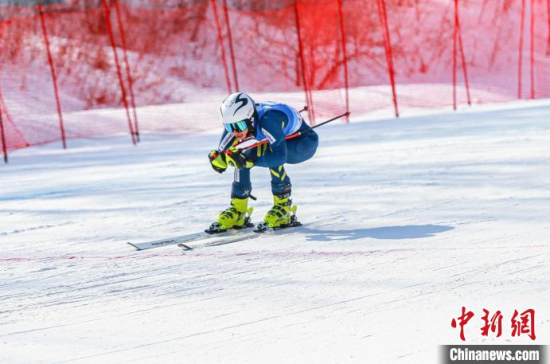 全國高山滑雪冠軍賽在吉林松花湖雪場正式開賽,選手正在比賽!∷贾Z 攝