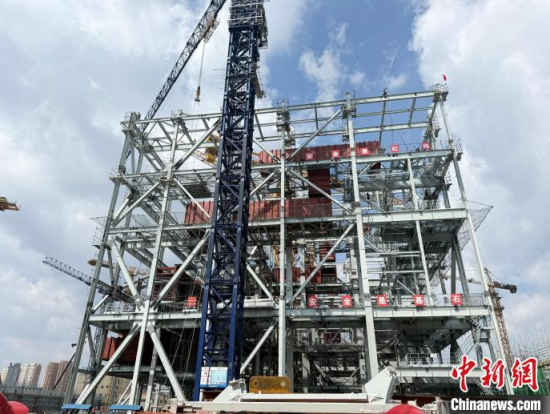 記者在施工現(xiàn)場看到,千余名工人與塔吊等機械協(xié)同作業(yè),安裝鍋爐鋼架、煙筒筒壁、冷卻塔、脫硫設施等關鍵設施。