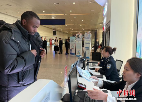 1月20日,吉林長春,外國留學生在長春龍嘉國際機場“吉便利”出入境一站式綜合服務窗口辦理相關業(yè)務!≈行律缬浾 張瑤 攝