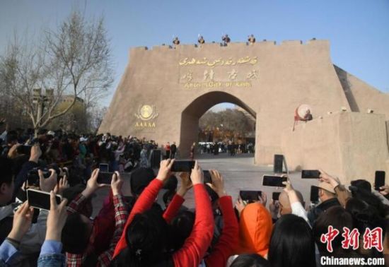 圖為來(lái)自五湖四海的游客在喀什古城觀賞開(kāi)城儀式!O亭文 攝