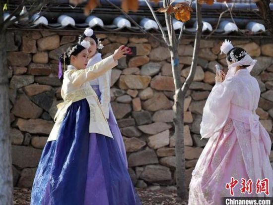 11月4日,在吉林省延邊朝鮮族自治州延吉市的中國(guó)朝鮮族民俗園內(nèi),游客身著朝鮮族服飾拍照留念。延邊是中國(guó)最大的朝鮮族聚居區(qū),濃郁的民族風(fēng)情吸引大量游客前來(lái)觀光體驗(yàn)。