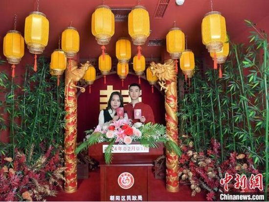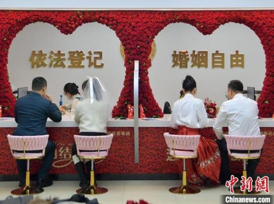 2月1日,在長春市朝陽區(qū)婚姻登記處,多對新人在辦理結(jié)婚登記。該婚姻登記處近日打造了三種不同風(fēng)格的拍攝場景,并為新人準(zhǔn)備了鮮花、婚紗以及特色服裝等,給前來登記結(jié)婚的新人一個大大的驚喜。