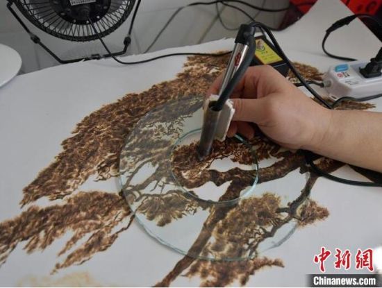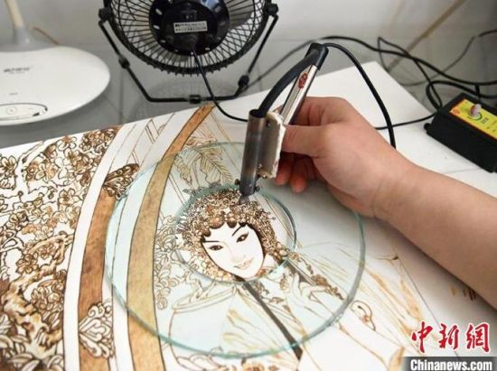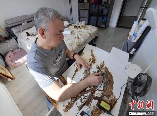 4月3日,吉林長春,56歲的長春市民王巖在工作室進行烙畫創(chuàng)作。自幼熱愛繪畫的王巖,在機緣巧合下接觸到烙畫技藝,從此便悉心鉆研。烙畫又稱火筆畫,是指用火燒烙鐵在物體上熨出烙痕作畫的一項技藝。