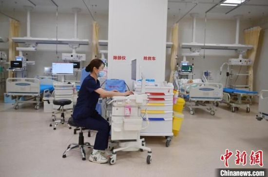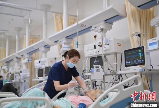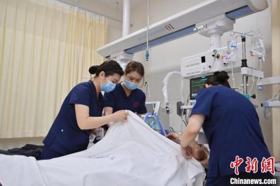 張力(左)對急診監(jiān)護(hù)區(qū)每位患者的情況都爛熟于心。護(hù)士們與患者朝夕相處,細(xì)心照護(hù),關(guān)系已經(jīng)超出了普通的醫(yī)患關(guān)系。張力說:“他們的親屬不能在身邊陪伴,但是我們每天可以和他們在一起,我們和這些患者的關(guān)系像親人一樣! 張瑤 攝
