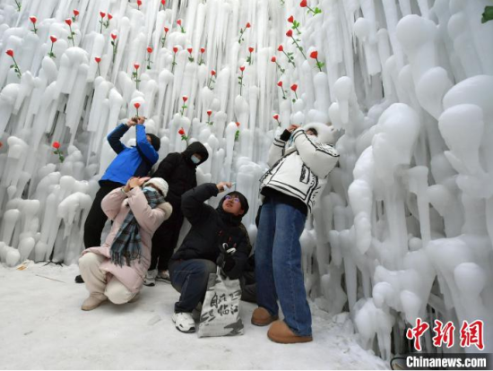 12月26日,吉林長白山,游客在冰洞內(nèi)打卡。進(jìn)入雪季,長白山推出“愛心冰封玫瑰”吸引大量游客打卡拍照,冰洞內(nèi)被玫瑰道具環(huán)繞,洞頂呈心形,充滿浪漫氣息。