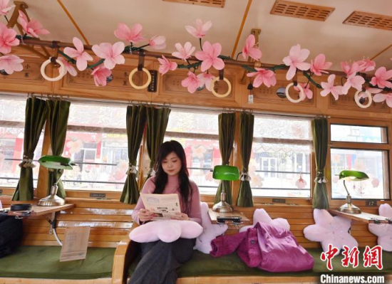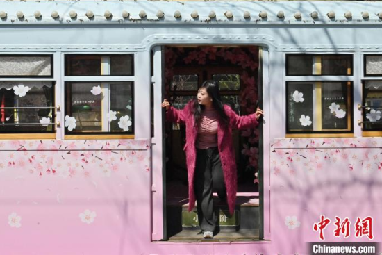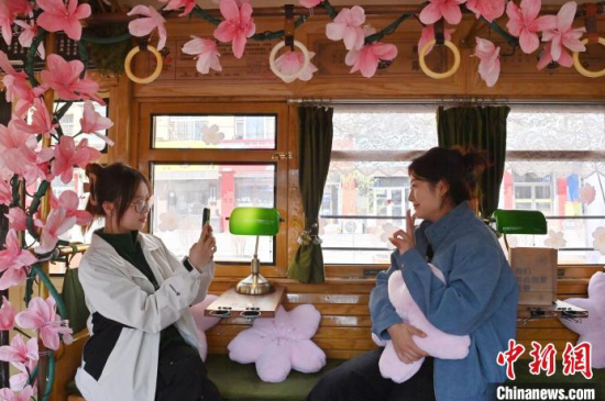 4月18日,吉林長(zhǎng)春,游客在54路文旅春日限定專列上拍照留念。該專列車廂內(nèi)外融入了桃花的設(shè)計(jì)元素,營(yíng)造出濃郁的春意,吸引了眾多游客前來(lái)打卡。中新社記者 張瑤 攝
