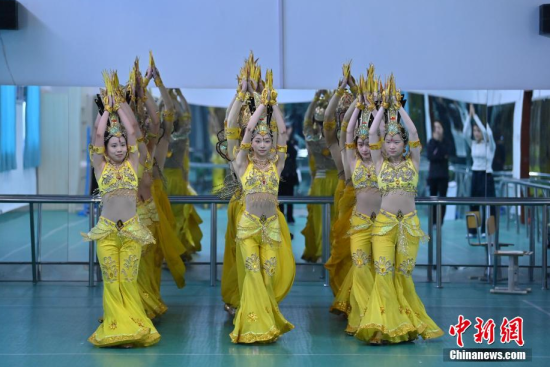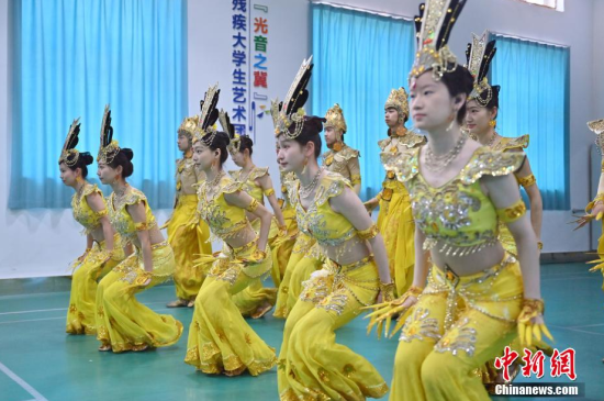 4月22日,在長春大學(xué)特殊教育學(xué)院,學(xué)生們?cè)谂啪殹肚钟^音》。這所學(xué)院擁有一支由29名聽障學(xué)生組成的舞蹈團(tuán)隊(duì)。他們因?qū)ξ璧傅臒釔鄱奂谝黄,在無聲的世界中舞出他們精彩的人生篇章。中新社記者 張瑤/攝