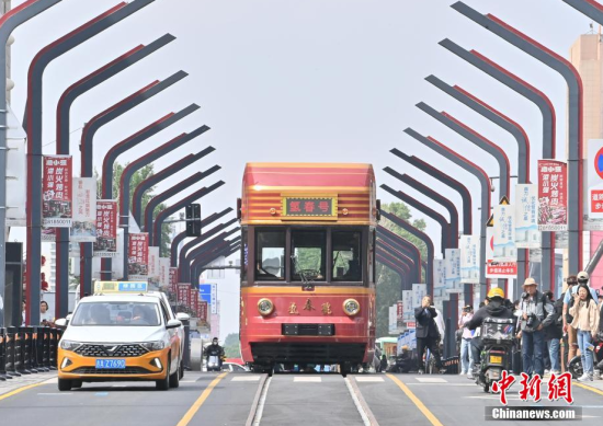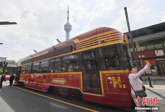 6月4日,吉林長春,市民在氫能源文旅專列旁拍照。該專列由中車長客研制,以歷史文化街區(qū)新民大街建筑群為設(shè)計靈感,車內(nèi)君子蘭花海主題內(nèi)飾與復(fù)古留聲機(jī)相映成趣。列車采用三級安全防護(hù)氫能系統(tǒng),單次加氫續(xù)航320公里。中新社記者 張瑤 攝