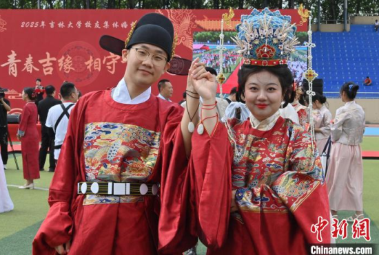 6月21日,吉林大學(xué)中心校區(qū)舉行2025年校友集體婚禮,36對(duì)新人從四面八方相聚在母校,在眾人矚目下有序步入婚禮主舞臺(tái),沿途得到學(xué)弟學(xué)妹們的熱情祝福。中新社記者 張瑤 攝
