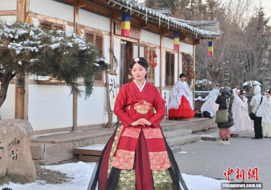 12月2日,在吉林省延邊州延吉市中國(guó)朝鮮族民俗園內(nèi),游客身著朝鮮族服飾拍照。作為中國(guó)唯一的朝鮮族自治州和最大朝鮮族聚居地,延邊近年旅游熱度持續(xù)攀升,朝鮮族服飾旅拍已成為當(dāng)?shù)刈钍軞g迎的旅游體驗(yàn)之一。盡管遭遇降溫降雪天氣,游客熱情依然不減,在銀裝素裹的園中定格獨(dú)具民族風(fēng)情的畫面。中新社記者 張瑤 攝