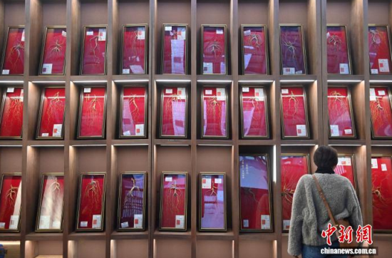12月7日,吉林長春,參觀者在參觀人參。當日,2025長春國際醫(yī)藥健康產(chǎn)業(yè)博覽會開幕,具有當?shù)靥厣那暌吧絽ⅰ⑷藚吮驹谌藚⒄箙^(qū)展出,吸引了參觀者的目光。中新社記者 張瑤 攝